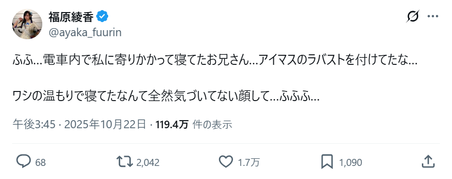| … | 34無念Nameとしあき 25/10/22(水)17:57:05No.25270585そうだねx3 1761123425224.png-(66239 B) ムジーナ大好き福原綾香(渋谷凛の中の人)のツイート |