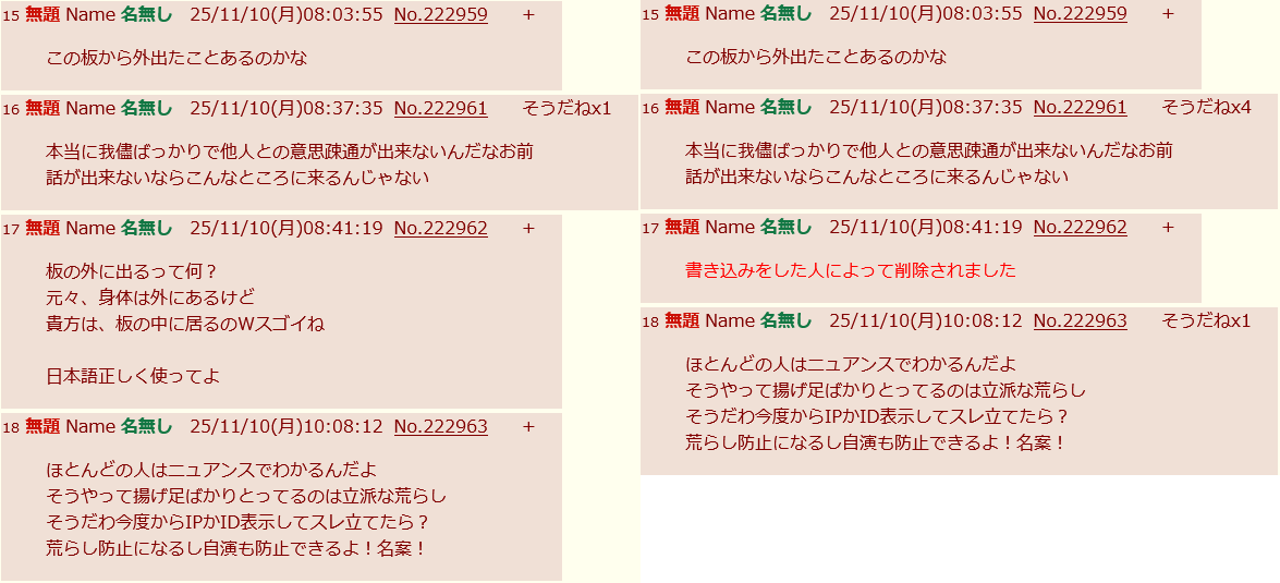 | … | 16無題Name名無し 25/11/10(月)08:37:35No.222961そうだねx5本当に我儘ばっかりで他人との意思疎通が出来ないんだなお前 |