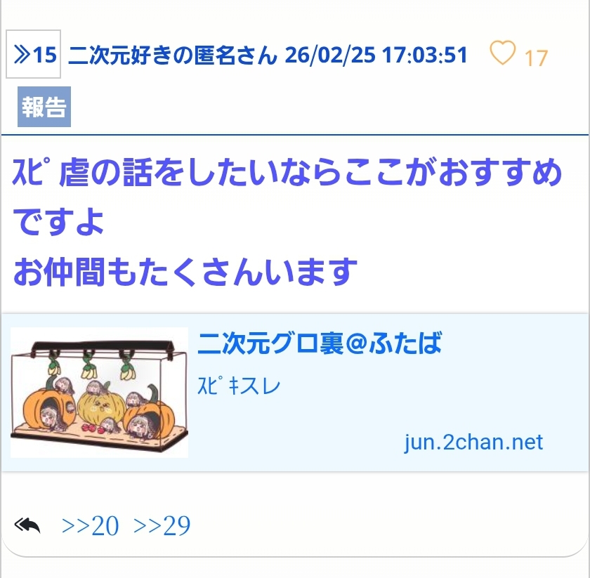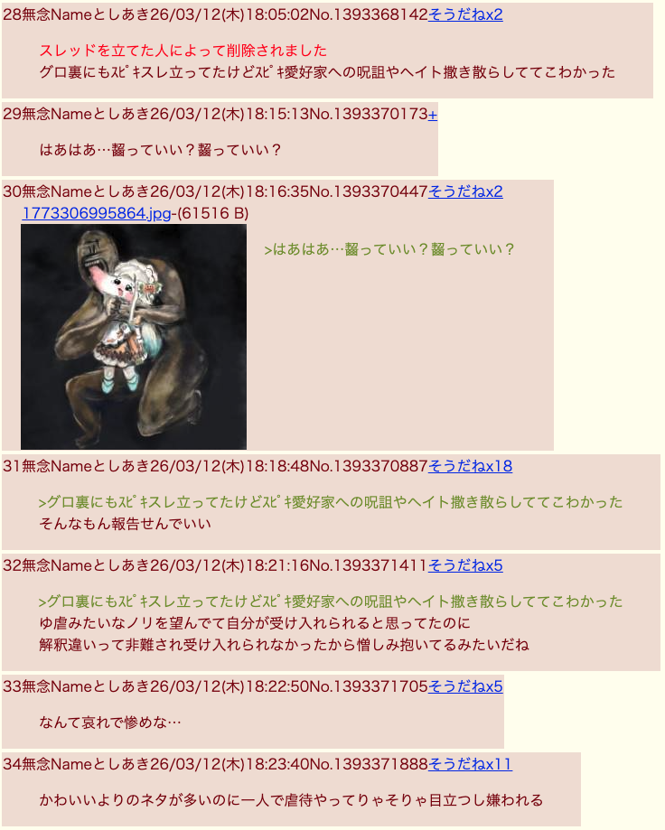 | … | 963無題Nameとしあき 26/03/24(火)15:12:27No.1532507そうだねx3>そもそも虐も公にやるもんじゃないからね |