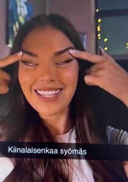 SNS上で目を細めるように指で引っ張りながら笑う姿とともに、字幕で「中華料理」と書かれた写真を投稿。ミス・フィンランド公式は、人種差別や差別的行為を一切容認しないと表明していた