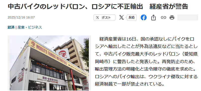 中古バイクのレッドバロン、ロシアに不正輸出 経産省が警告レス3件省略。全て読むには返信ボタンを押してください。