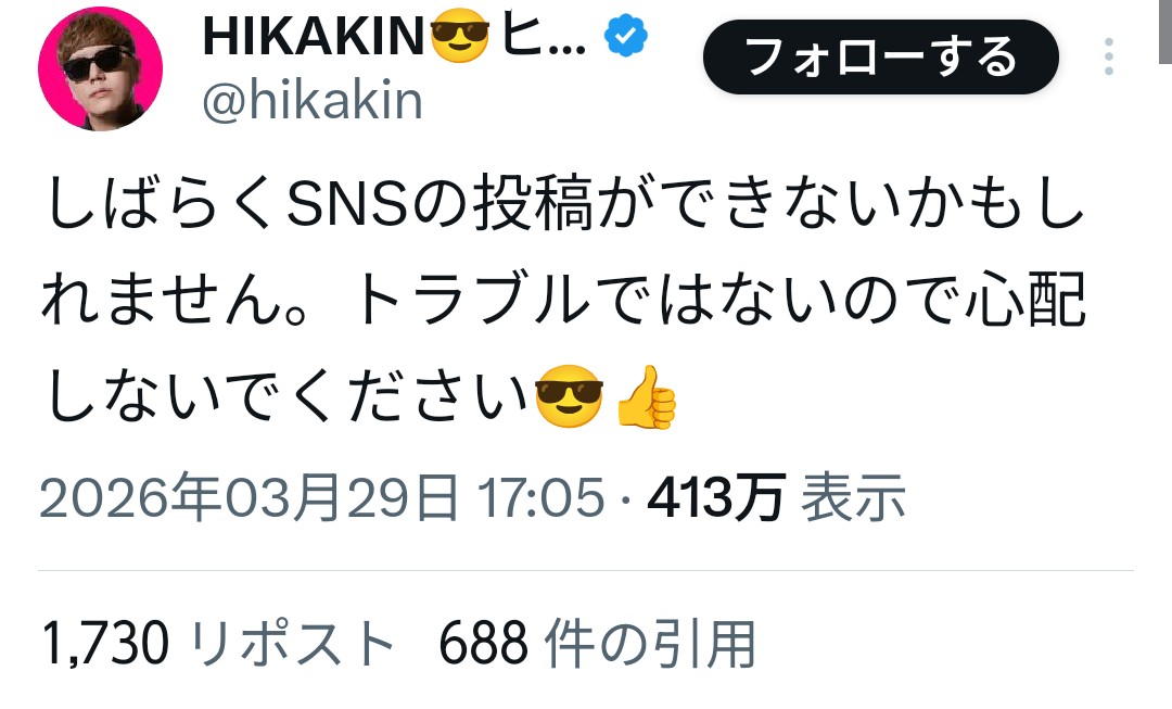 人気YouTuberヒカキンのHikakinTVで3月28日朝から始まった異様なライブ配信は、黒い画面と波音だけが続き約24時間後に終了した。視聴者は無人島ロケかと思いきや、ハッキングや事故の憶測がXで広がり、数千人が見守った。ヒカキンは29日朝に「SNS投稿できないかも、トラブルではない」と投稿し、5万超のいいねを集めて事態を収束させた。詳細は不明で、ファンからは安堵と疑問の声が上がっている。