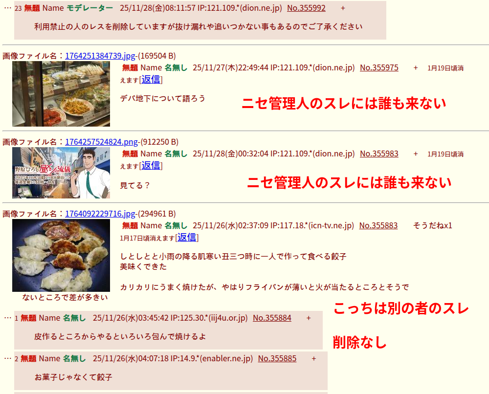 | … | 1無題Name名無し 25/11/28(金)08:37:23 IP:14.9.*(enabler.ne.jp)No.103376+管理人代行なんて偉そうなものは存在しない |